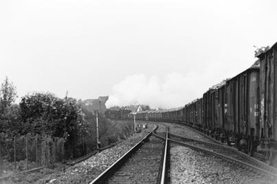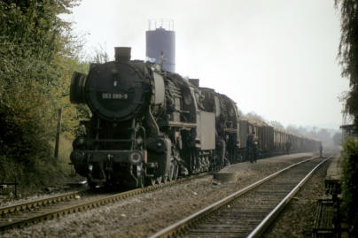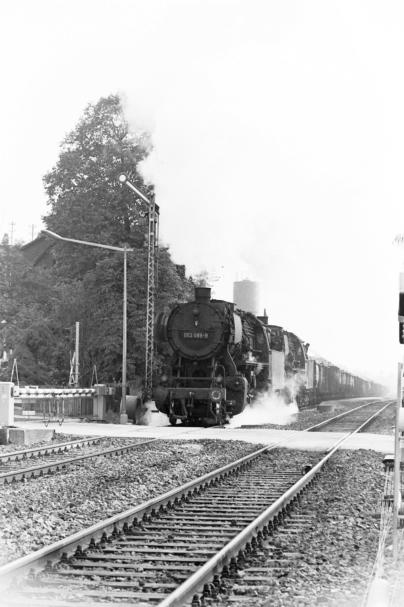053 089-9 und 051 795-3 am 09.10.1975 mit einem Zuckerrübenzug (Dg 77 286) bei der Ausfahrt aus dem Bf Neuenstein Richtung Öhringen. Der Bahnübergang existiert längst nicht mehrFoto: O. Schmolinske, Esslingen