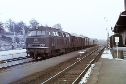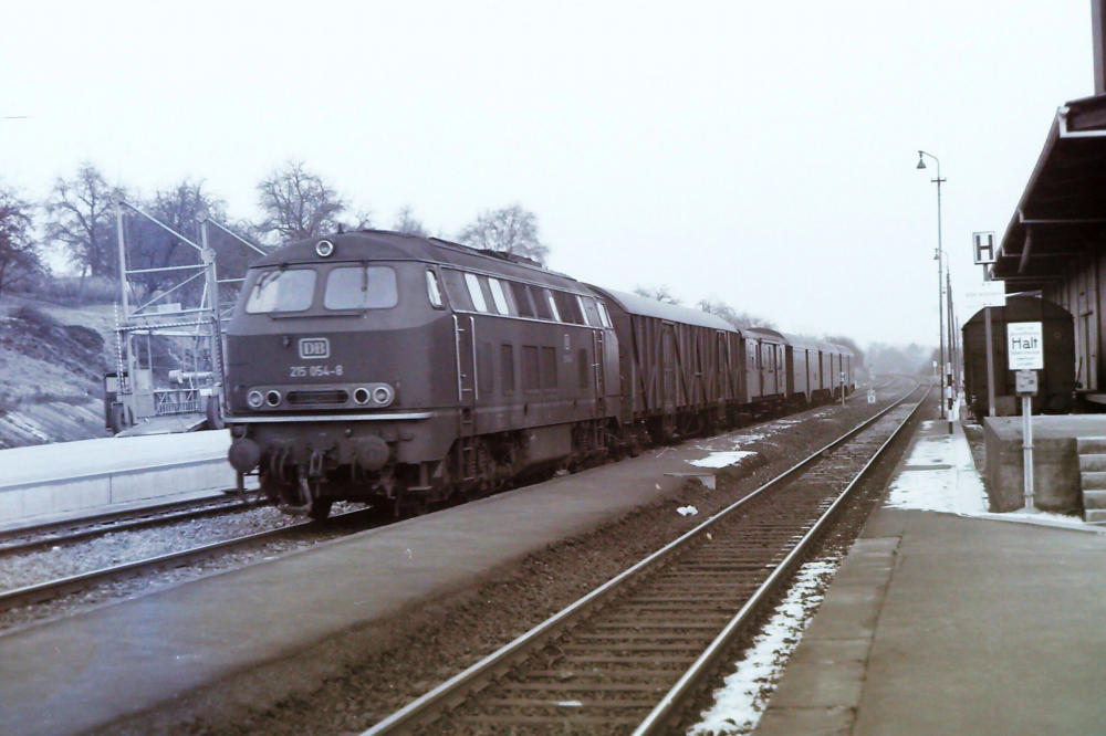 215 054-8 am 16.02.1981 in Neuenstein. Der Landhandel bekommt noch Waggons, die Einrichtung zur Verladung von Zuckerrüben ist noch da und der ganze Bahnhof macht einen sauberen Eindruck. Heute gibt es viel mehr Vegetation im Bahnhof und in den Gleisen.Foto: Christoph Bolay, Öhringen