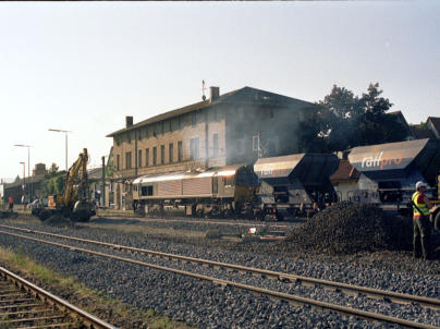 (ex 360 413) am 28.05.2005 mit Schotterwagen im Bf Öhringen.