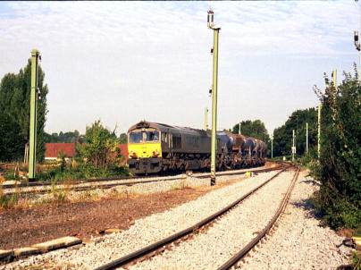 Selbstentladewagen und einer Großdiesellok Class 66.
