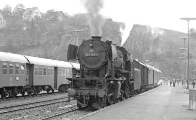 023 055-9 im Bahnhof Schwäbisch Hall.Foto: Burkhard Wollny, GöppingenHeute gibt es hier nur noch die zwei durchgehenden Haupt-gleise und eine Bahnsteigkante, um auf aufwändigeBahnsteig-Zugänge verzichten zu können. Reisezüge Richtung Hessental müssen beim beim Halt das Gleis derGegenrichtung blockieren.