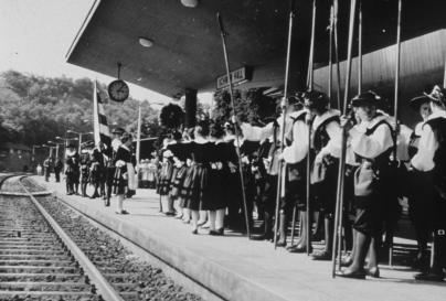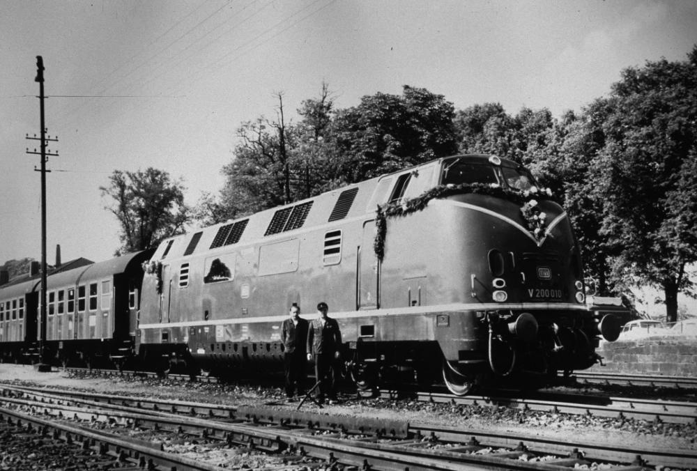 V 200 010 mit einem Sonderzug zum 100-jährigen Streckenjubiläum der Hohenlohebahn am 04. August 1962. Der Sammlung von Hans Noller verdanken wir die bislang einzigen Bilder der Feiern von 1962.Im Bahnhof Schwäbisch Hall sind zu diesem Anlass die Haller Salzsieder aufgetreten.Foto: Nachlass Hans NollerLandesarchiv Baden-WürttembergAbt. Staatsarchiv Ludwigsburg PL 723 DK 56-28 Bild 1http://www.landesarchiv-bw.de/plink/?f=2-3148106