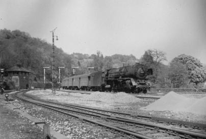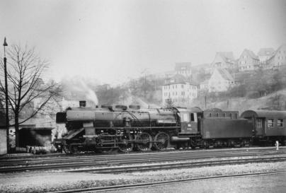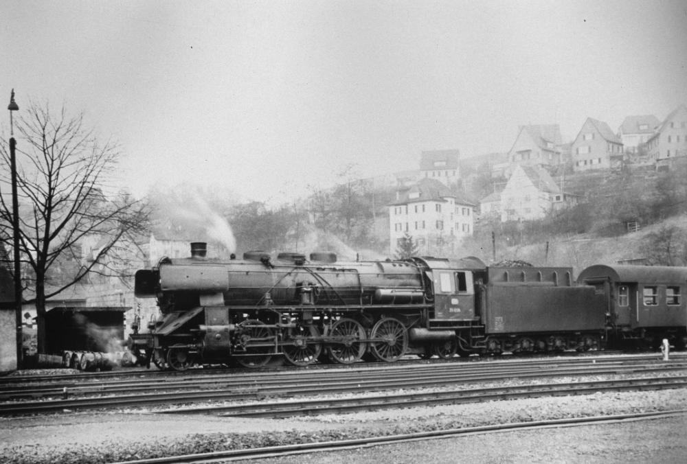 01 112 im Bahnhof Schwäbisch Hall am 22.05.1965.Auf vier Gleisen konnte damals der Bahnhof Schwäbisch Hall mit Zugfahrten durchfahren werden. Heute ist dieser Bahnhof zwar im bahnbetrieblichen Sinne zwar noch einBahnhof, aber die Anlagen wurden auf das Nötigstereduziert. Foto: Nachlass Hans NollerLandesarchiv Baden-WürttembergAbt. Staatsarchiv Ludwigsburg PL 723 DK 56-30 Bild 1http://www.landesarchiv-bw.de/plink/?f=2-3148108