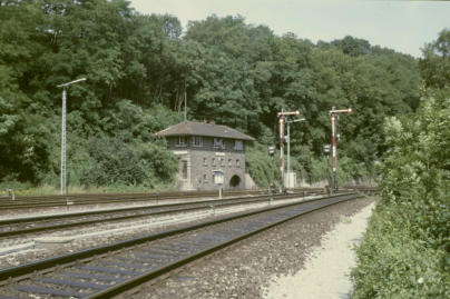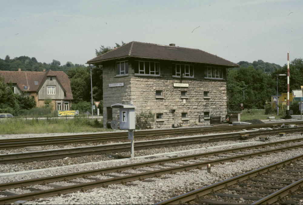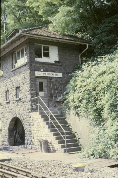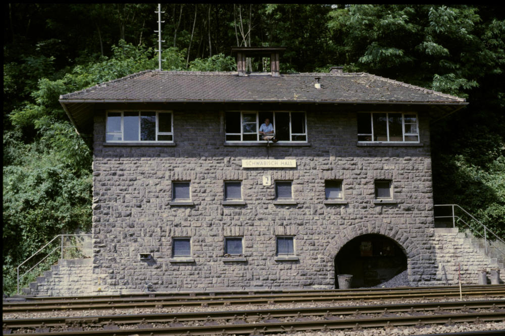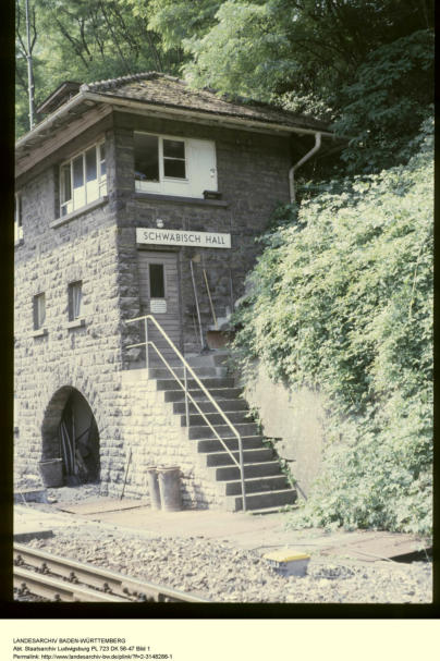 Das Stellwerk 1 in Schwäbisch Hall im Jahre 1986Foto: Nachlass Hans NollerLandesarchiv Baden-WürttembergAbt. Staatsarchiv Ludwigsburg PL 723 DK 56-42 Bild 1http://www.landesarchiv-bw.de/plink/?f=2-3148281