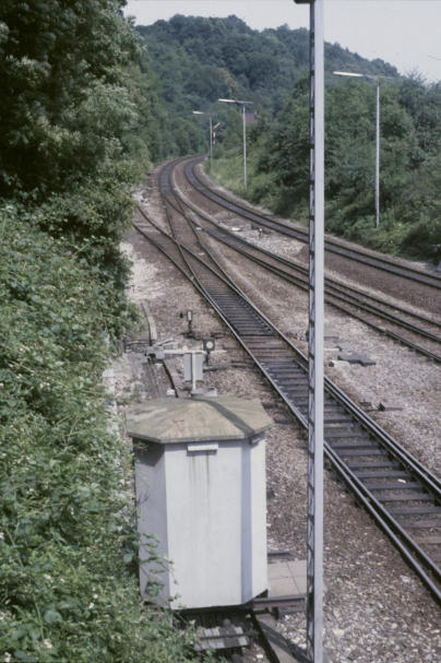 Blick vom (Fdl-) Stellwerk 2 in Schwäbisch Hall im Jahre 1986 auf die Strecke Richtung Waldenburg. Man sieht das Ausfahrtsignal des Bf Schwäbisch Hall Richtung Waldenburg.Foto: Nachlass Hans NollerLandesarchiv Baden-WürttembergAbt. Staatsarchiv Ludwigsburg PL 723 DK 56-50 Bild 1http://www.landesarchiv-bw.de/plink/?f=2-3148289