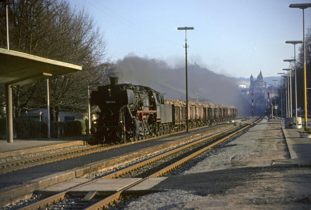 Am 08.01.1976 fährt die Lok 050 731-9 den letzten Rübenzugder Saison mit Ziel Zuckerfabrik Offenau durch den Bahnhof Schwäbisch Hall. Im Hintergrund sieht man die Comburg, ein „Muss“ bei einem touristischen Ausflug nach Hohenlohe. Foto: Armin Schmolinske, Hamburg.