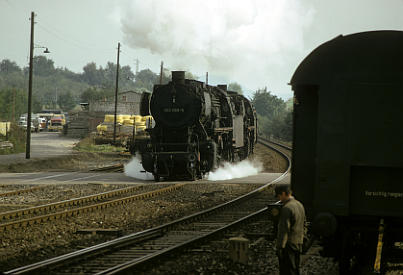 Am 09.10.1975 fährt ein Zug mit den beiden Loks 053 089-9 und 051 795-3 durch Weinsberg in Richtung Heilbronn.Foto: Armin Schmolinske, Hamburg