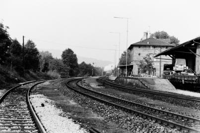 So sah der Weinsberger Bahnhof am 09.10.1975 aus, wenn man vom Stellwerk am Bahnübergang Richtung Heilbronn schaut.Foto: O. Schmolinske, Esslingen