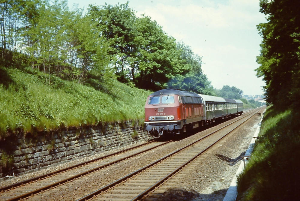 215 077-9 fährt am 30.05.1978 westlich von Öhringen
