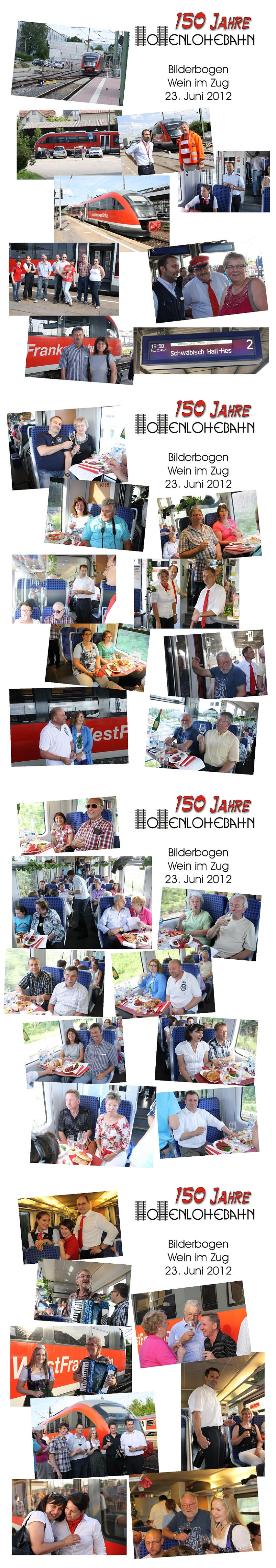 Am 23.06.2012 fuhr ein Eventzug unter dem Motto „Wein im Zug“ als dritter Zug in der vierteiligen Eventzug-reihe im Rahmen der Feiern zu „150 Jahre Hohenlohebahn“ von Heilbronn nach Schwäbisch Hall-Hessental und zurück. An diesem Samstag Abend konnten die Teilnehmer bei bestem Wetter eine tolle Weinprobe ausgerichtet von den vier Weingütern Weingut Schäfer-Heinrich, Heilbronn Weingut Laicher, Obersulm-Willsbach Weingut Busch, Bretzfeld-Dimbach bzw. „Bahnhof Busch“ in Bretzfeld und Weingut Fürst zu Hohenlohe-Öhringen, Öhringen-Verrenberg (aufgezählt in Fahrtrichtung!)erleben. Die Hohenloher Weinprinzessin Elena Thomä aus Bretzfeld-Adolzfurt war mit an Bord und hat dieWinzer bei der Weinvorstellung unterstützt. Im rollierenden Vortrag vor den Fahrgästen von drei bis vier Sitzgruppenim modernen Nahverkehrstriebwagen der Baureihe 642 der Westfrankenbahn haben alle Teilnehmer auch in dieser für eine Weinprobe unkonventionellen Umgebung viel Interessantes über den Weinbau entlang der Hohenlohebahn erfahren. Teilweise fuhr der Zug zeitgleich durch die Weinberge, in denen die Trauben der zu verkostenden Weine wuchsen.